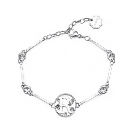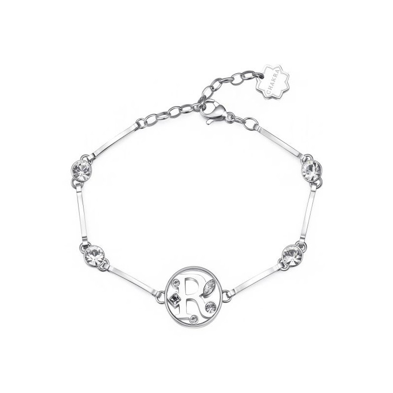 Descrizione: bracciale a settori in acciaio anallergico - cristalli bianchi - simbolo lettera dell'alfabeto - chiusura a moschettone - misura regolable da 16 a 18 cm