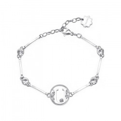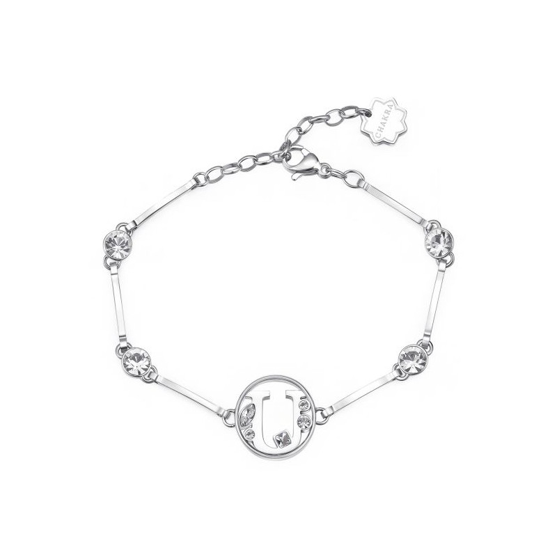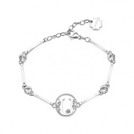 Descrizione: bracciale a settori in acciaio anallergico - cristalli bianchi - simbolo lettera dell'alfabeto - chiusura a moschettone - misura regolable da 16 a 18 cm