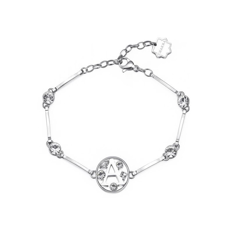 Descrizione: bracciale a settori in acciaio anallergico - cristalli bianchi - simbolo lettera dell'alfabeto - chiusura a moschettone - misura regolable da 16 a 18 cm