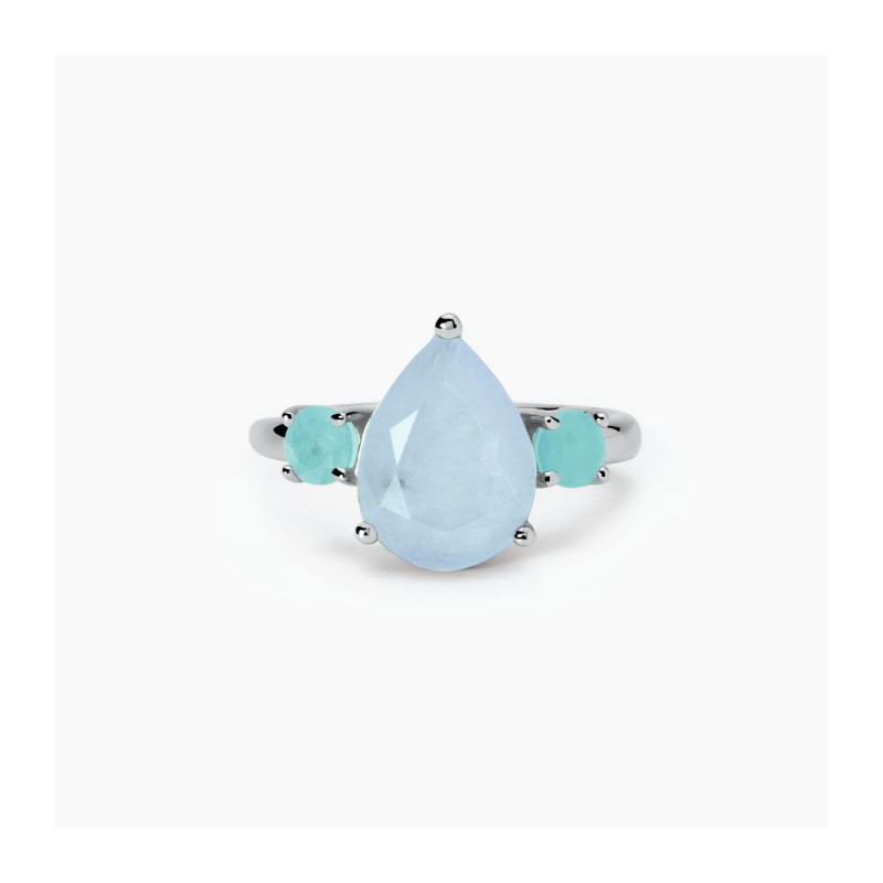 Descrizione: Anello regolabile da donna in argento 925 rodiato con fusion stone di glass azzurro e cristallo di rocca taglio goccia, e glass azzurro taglio tondo.