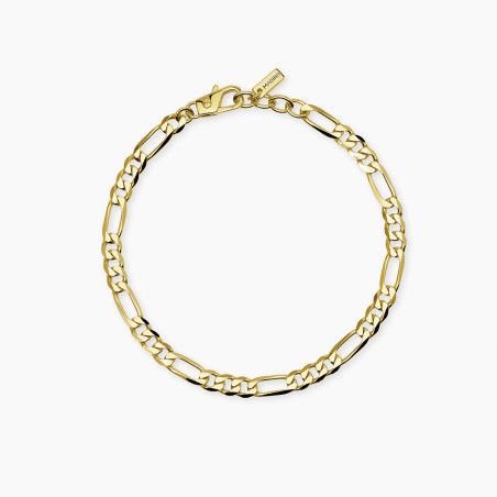 Descrizione: Bracciale in argento 925 e placato oro 18k con catena figaro. Larghezza catena : 5 mm. Chiusura con moschettone. Lunghezza regolabile da 19 a 21cm.