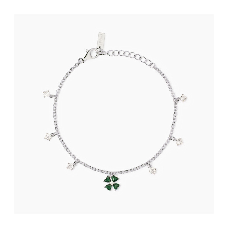 Descrizione: Bracciale in argento 925 con catena forzatina. Ciondoli zirconi e quadrifoglio con pietre taglio cuore - misura regolabile da 16 a 19 cm
