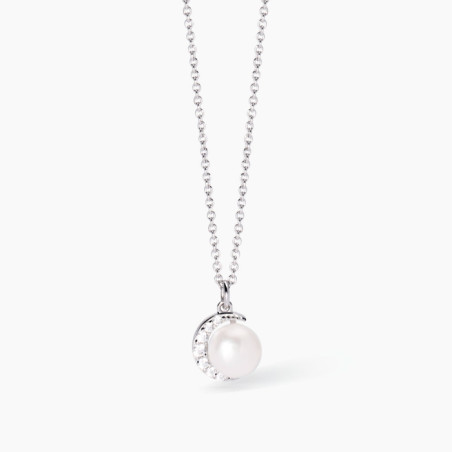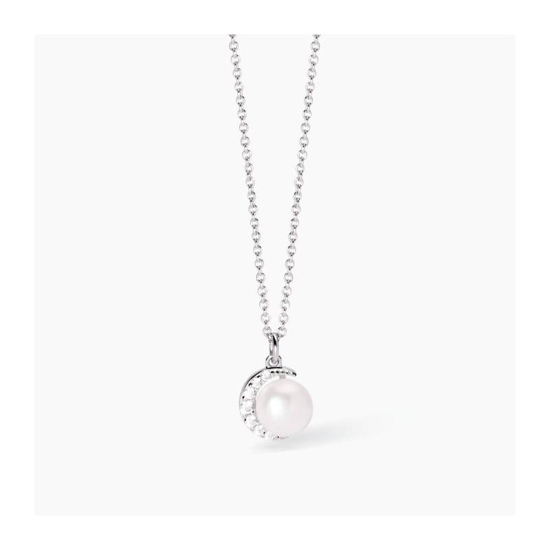 Descrizione: Girocollo regolabile da donna in argento 925 rodiato con catena rolò e pendente con perla bottone coltivata e luna crescente di zirconi.