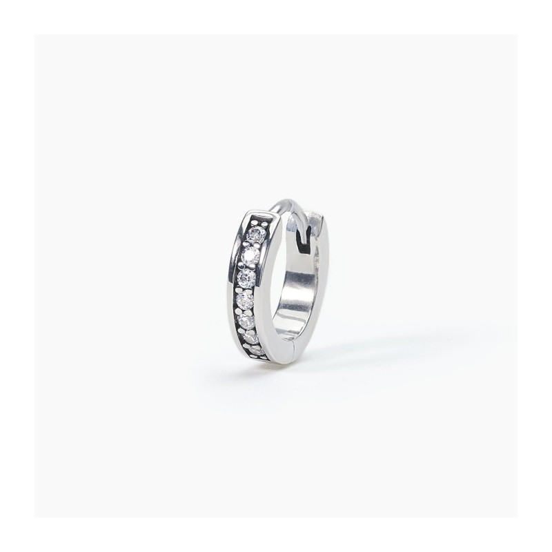 Descrizione: Orecchino a cerchio in argento 925 rodiato con pietre sintetiche. Chiusura a scatto