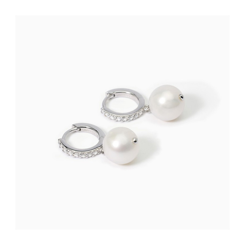 Descrizione: Orecchini da donna a cerchio in argento 925 rodiato con perla coltivata pendente e zirconi bianchi.