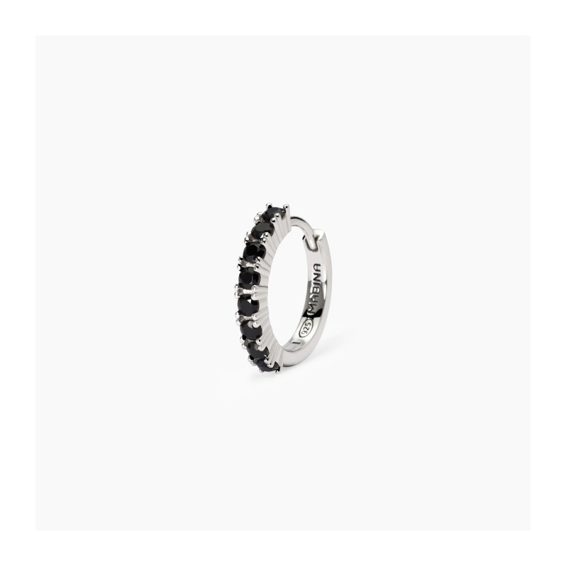 Descrizione: Orecchino da uomo a cerchio in argento 925 rodiato con zirconi. Diametro degli zirconi: 2.25 mm. Chiusura a scatto