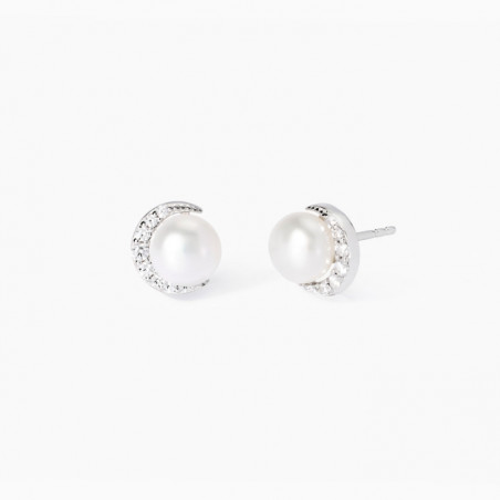 Descrizione: Orecchini da donna a lobo in argento 925 rodiato con perle bottone coltivate e lune crescenti di zirconi.