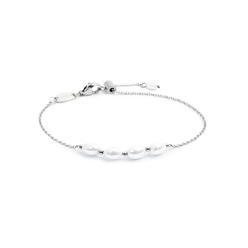Descrizione: bracciale in acciaio con catena cross, al centro perle ovali bianche rivestite alternate ad elementi di acciaio. Tag ovale con il logo Marlù ad una estremità vicino al moschettone. All'altra estremità una perla ovale bianca rivestita. Lunghezza totale 19 cm regolabile tramite cursore.