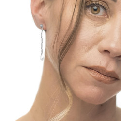 Descrizione: mono orecchino in acciaio con sfera e pendente removibile composto da catena figaro con trama ed all'estremità una perla bianca irregolare rivestita. Lunghezza totale 5,2 cm.