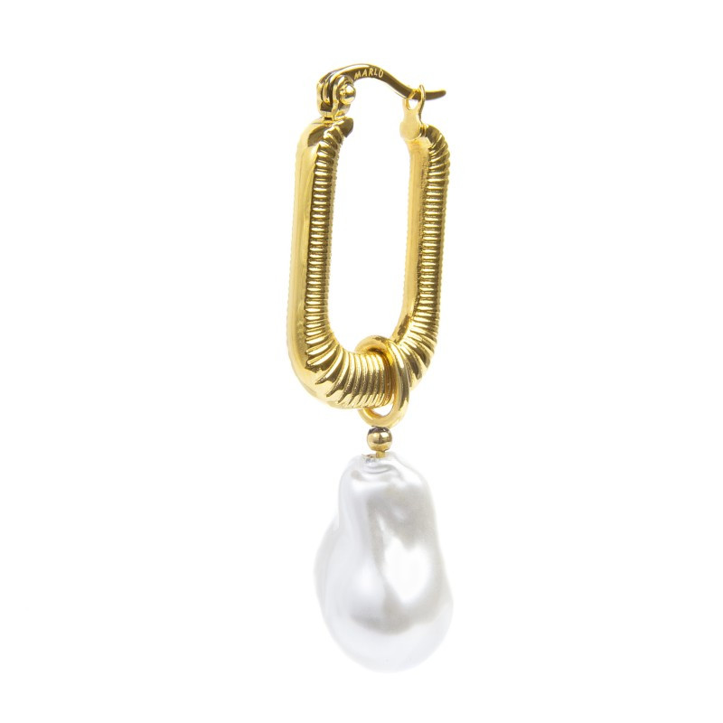 Descrizione: mono orecchino in acciaio a cerchio ovale con trama di dimensione 1,7 x 2,6 cm, con perla irregolare rivestita pendente. Marlù logo laserato sulla chiusura. Lunghezza totale 4 cm.