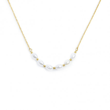 Descrizione: collana in acciaio con catena cross, al centro perle ovali bianche rivestite alternate ad elementi di acciaio. Tag ovale con il logo Marlù ad una estremità vicino al moschettone. All'altra estremità una perla ovale bianca rivestita. Lunghezza totale 44 cm regolabile tramite cursore.