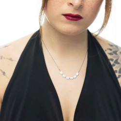 Descrizione: collana in acciaio con catena cross, al centro perle ovali bianche rivestite alternate ad elementi di acciaio. Tag ovale con il logo Marlù ad una estremità vicino al moschettone. All'altra estremità una perla ovale bianca rivestita. Lunghezza totale 44 cm regolabile tramite cursore.