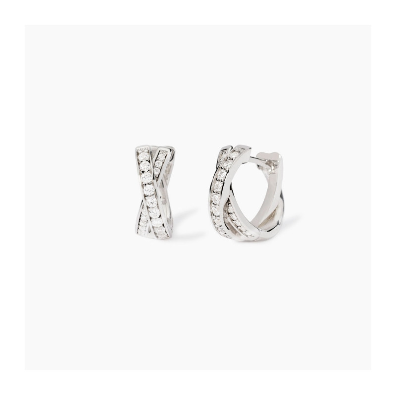 Descrizione: orecchini a cerchio incrociati in argento 925 rodiato con zirconi fi 1,5 e 1 mm.