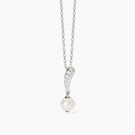 Descrizione: girocollo in argento 925 rodiato con catena rolò 1,5 mm, pendente con pavé di zirconi fi 1,25 mm e perla coltivata fi 5,5 - 6 mm.