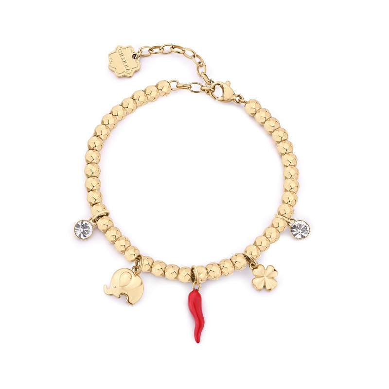 Descrizione: bracciale in acciaio anallergico con maglia a forma di sfere irregolari sfaccettate e charms scaramantici come il cornetto, l'elefante ed il quadrifoglio con smalto a freddo e cristalli