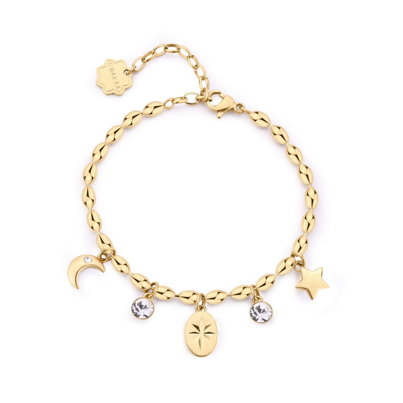 Descrizione: bracciale in acciaio anallergico lucido con maglia a forma di chicchi di riso e charms a forma di astri come la luna, la rosa dei venti e la stella e cristalli