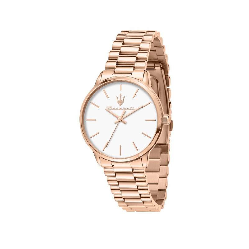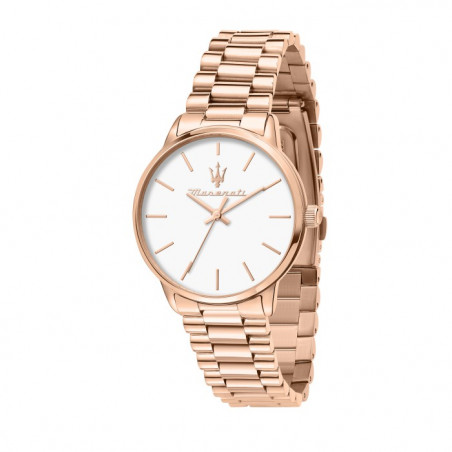 Descrizione: orologio solo tempo movimento 2035 al quarzo, cassa e cinturino Pvd oro rosa e quadrante bianco. Chiusura: fibbia deployante con pulsanti. Funzioni: ore minuti e secondi. Vetro: minerale.