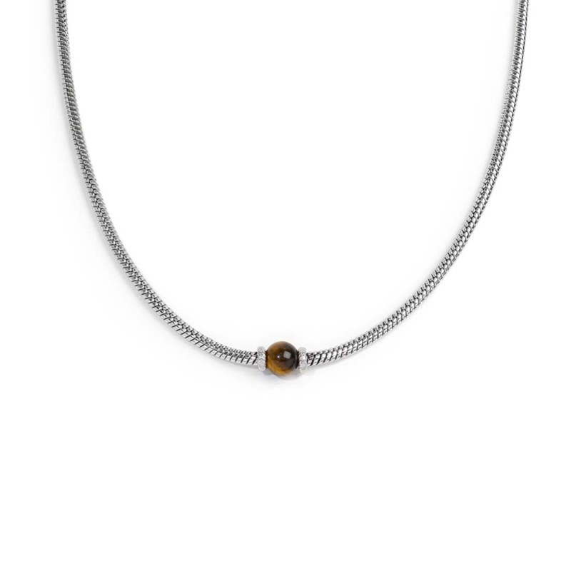Descrizione: Collana acciaio, catena snake tonda, pietra naturale, black oil. Estensione con catena rolò con trama, removibile e/o regolabile tramite moschettoni tondi. Lunghezza tot. 60cm regolabile da 60 a 50cm