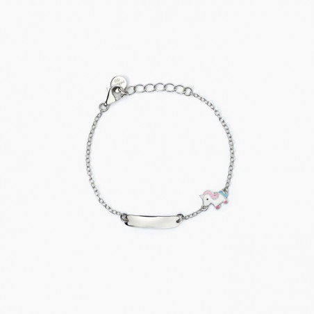 Descrizione: bracciale in argento 925 rodiato con catena forzatina 1.5 mm, piastra 17x4 mm ed elemento unicorno smaltato 8x7 mm