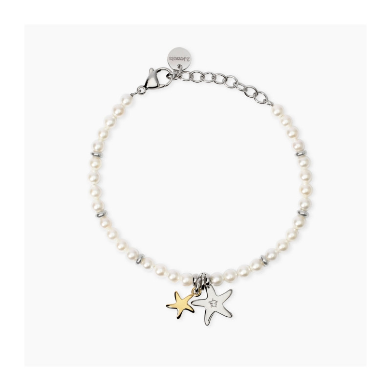 Descrizione: Bracciale in acciaio 316L con perle conchiglia fi 4 mm e ciondoli stella marina 12.5x12.5 mm e 8.5x8.5 mm in PVD giallo, cristallo fi 2 mm, lunghezza regolabile da 16 a 19 cm