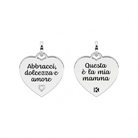 Descrizione: Ciondolo in acciaio 316L satinato cuore e cristallo. Scritta: Abbracci, dolcezza e amore, questa è la mia mamma. Dimensioni: ciondolo 15x15.2 mm, pietra fi 1.75 mm