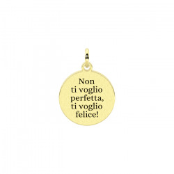 Descrizione: Ciondolo in acciaio 316L satinato con cristallo. Scritta: Non ti... felice!. Dimensioni: ciondolo fi 15 mm, pietra fi 1.75 mm