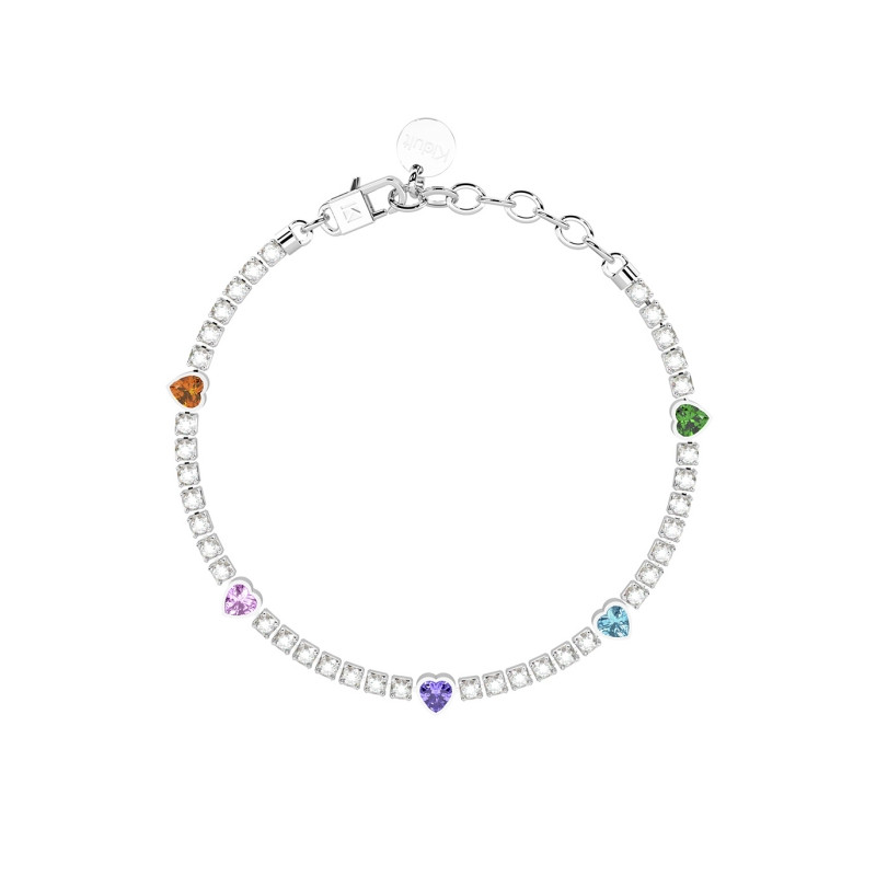 Descrizione: Bracciale tennis in acciaio 316L, lunghezza regolabile da 15.5 a 18 cm, con tennis di cristalli e zirconi taglio cuore. Dimensioni: cristalli fi 2.5 mm, zirconi 4x4 mm
