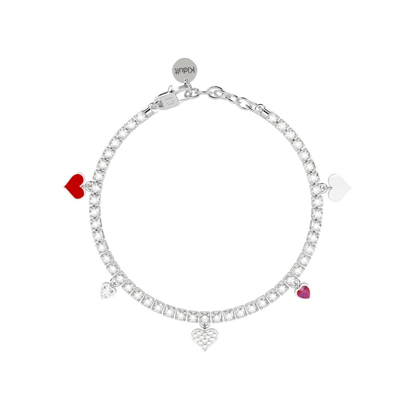 Descrizione: Bracciale tennis in acciaio 316L, lunghezza regolabile da 15.5 a 18 cm, ciondoli cuore lisci e smaltati, pietre. Dimensioni: cuori 8x6.7 mm, rubino sintetico 4x4 mm, cristalli fi 2.5 e 1.25 mm, zirconi 4x4 mm