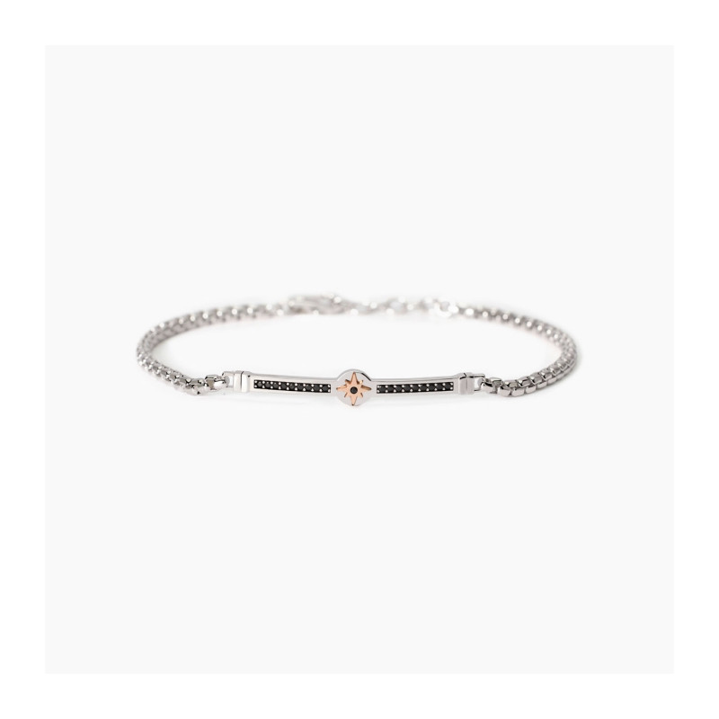 Descrizione: Bracciale in argento 925 con catena veneta 3 mm e placca centrale 40x6.5 mm rosa dei venti placcata oro rosa 18K con zirconi neri fi 1.25 mm, lunghezza regolabile da 19 a 21 cm