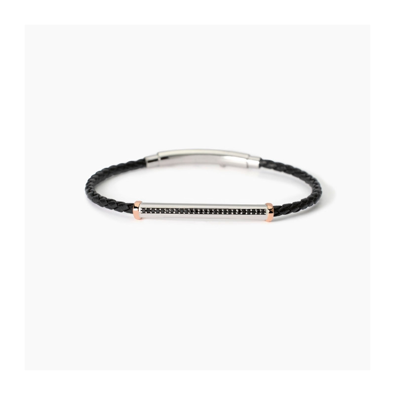 Descrizione: Bracciale in argento 925 con lab leather nera intrecciata fi 3 mm, piastra 40x5 mm centrale con elementi placcati oro rosa 18K, chiusura in acciaio 316L, lunghezza regolabile da 20 a 22 cm