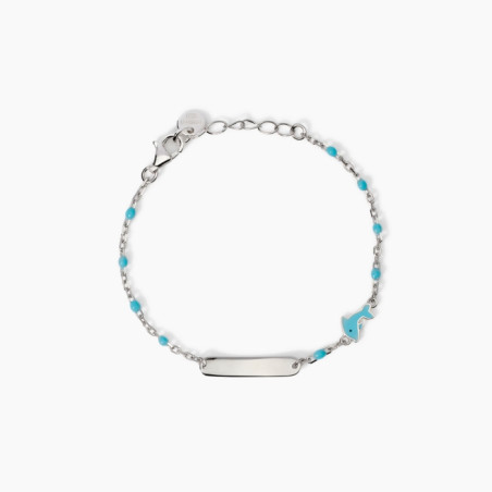 Descrizione: Bracciale in argento 925 con catena forzatina 1.4 mm, inserti ed elemento delfino 7x5 mm smaltati, piastra 17x3.7 mm, lunghezza regolabile da 12 a 14 cm