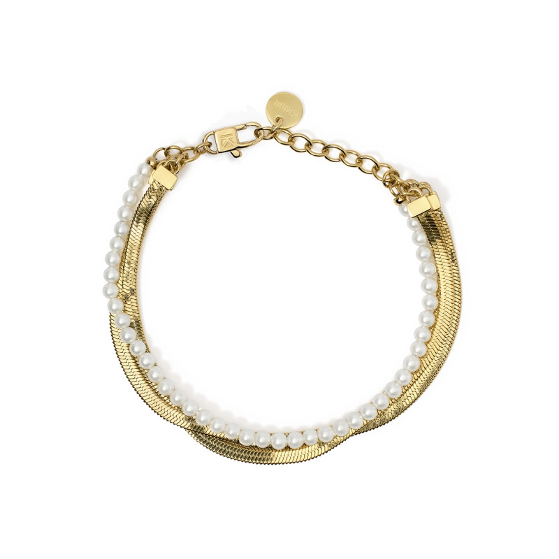 Descrizione: Bracciale in acciaio 316L. lunghezza regolabile da 16 a 19 cm, con catene herringbone e perle conchiglia. Dimensioni: catena 3 mm, perle conchiglia fi 3 mm