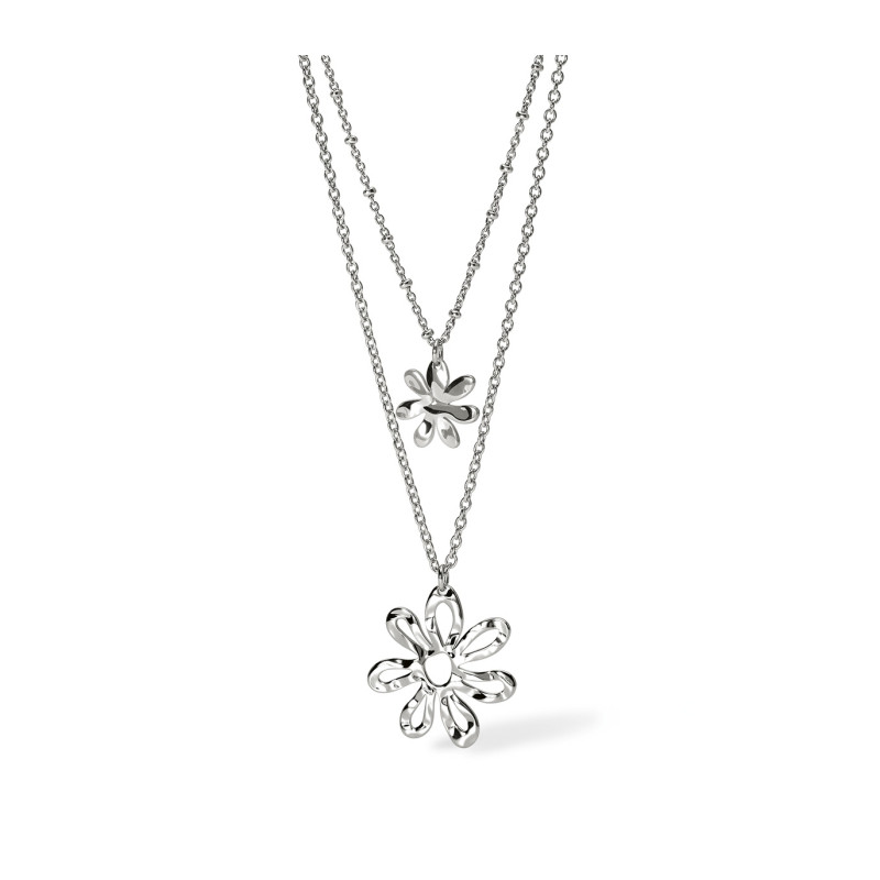 Descrizione: Girocollo in acciaio 316L. lunghezza regolabile da 38 a 43 cm, con catene rolò e pendenti martellati fiore. Dimensioni: catena 1.6 e 2 mm, pendenti 25x26.8 e 15x15 mm