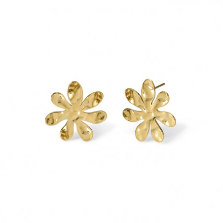 Descrizione: Orecchini in acciaio 316L martellato e PVD giallo fiore. Dimensioni: orecchino 2.5x2.7 cm