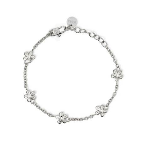 Descrizione: Bracciale in acciaio 316L. lunghezza regolabile da 16 a 19 cm, con catena rolò, elementi fiore e cristalli. Dimensioni: catena 2.3 mm, fiori 9x8.7 mm, pietre fi 1.5 mm