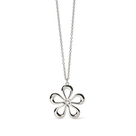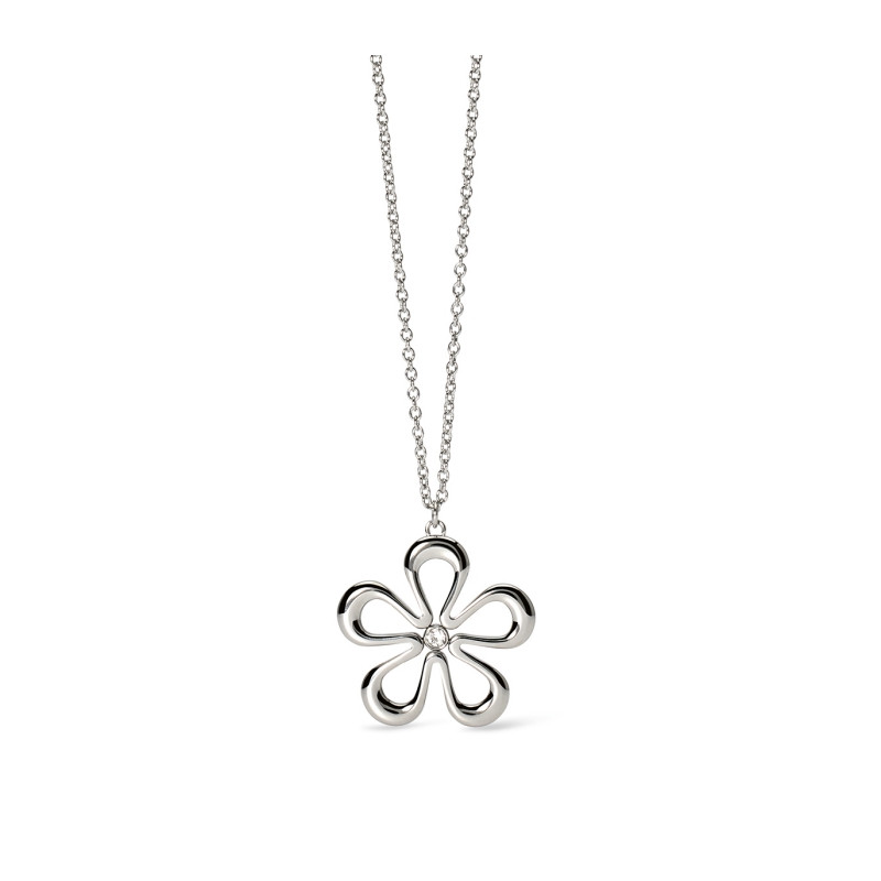 Descrizione: Collana in acciaio 316L. lunghezza 85 cm, con catena rolò, pendente fiore e cristallo. Dimensioni: catena 2 mm, pendente 32x31 mm, pietra fi 3 mm