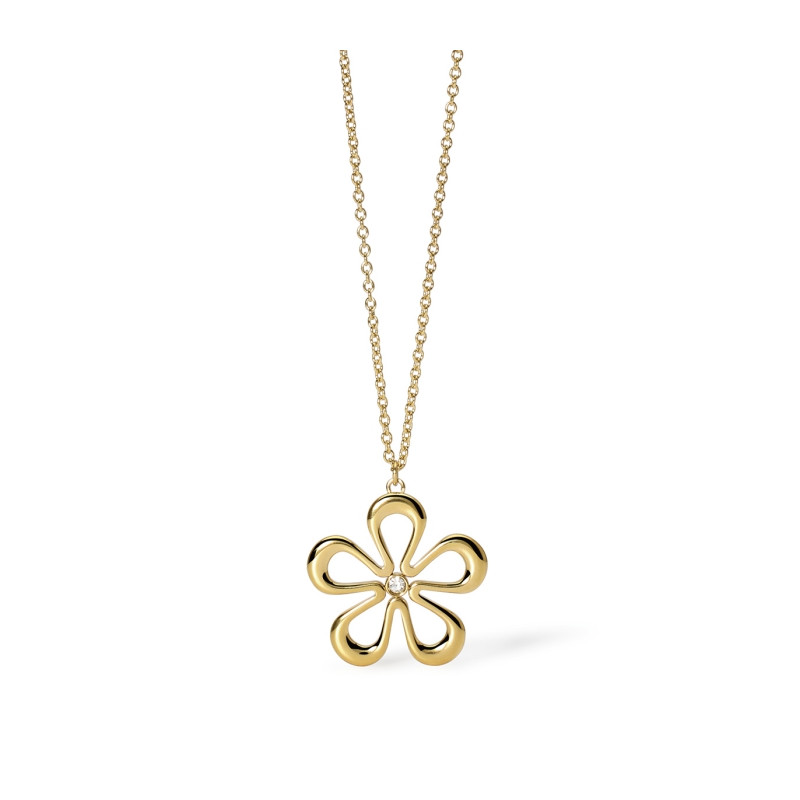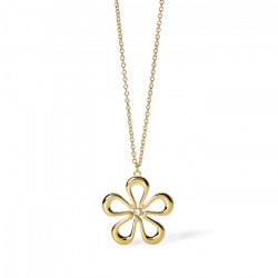 Descrizione: Collana in acciaio 316L. lunghezza 85 cm, con catena rolò, pendente fiore e cristallo. Dimensioni: catena 2 mm, pendente 32x31 mm, pietra fi 3 mm