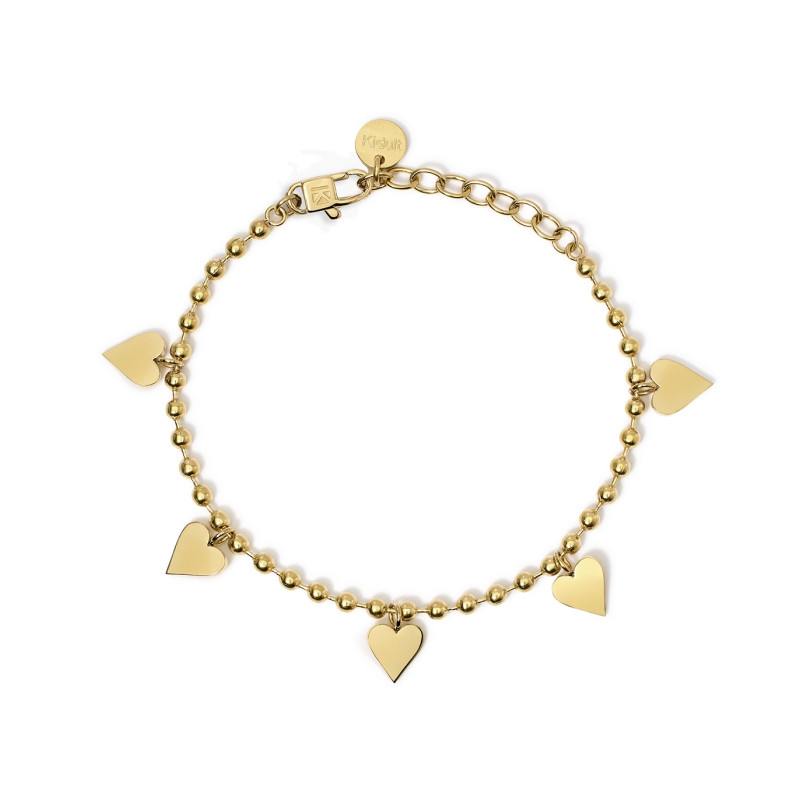 Descrizione: Bracciale in acciaio 316L. lunghezza regolabile da 16 a 19 cm, con catena a palline, ciondoli cuore. Dimensioni: catena 3.2 mm, ciondoli 8x8.6 mm