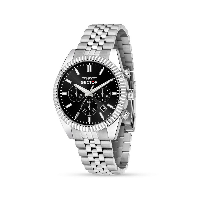Descrizione: orologio cronografo, movimento al quarzo JS25, cassa e cinturino braccialato in acciaio