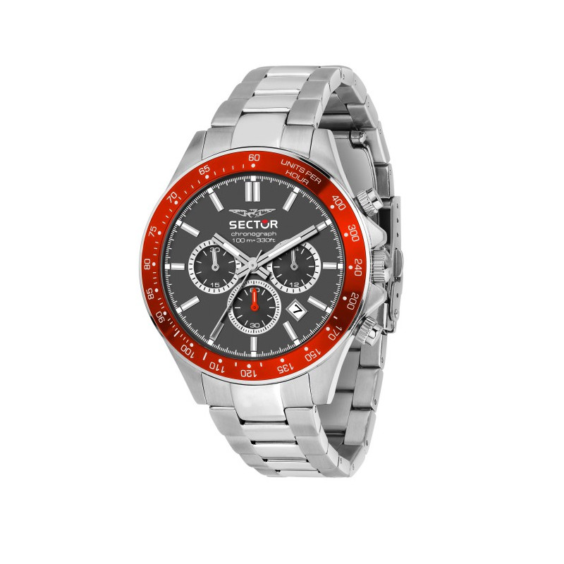 Descrizione: Orologio cronografo. Vetro minerale. Cassa e bracciale in acciaio o cinturino in silicone. Lunetta in alluminio Datario. Fondello a vite.