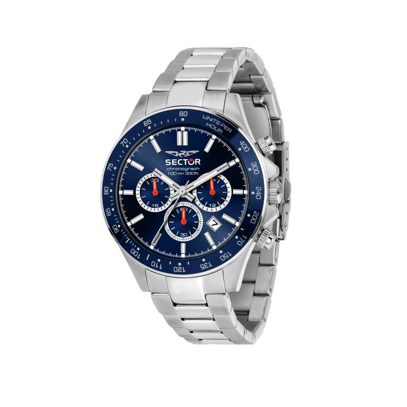 Descrizione: Orologio cronografo. Vetro minerale. Cassa e bracciale in acciaio o cinturino in silicone. Lunetta in alluminio Datario. Fondello a vite.