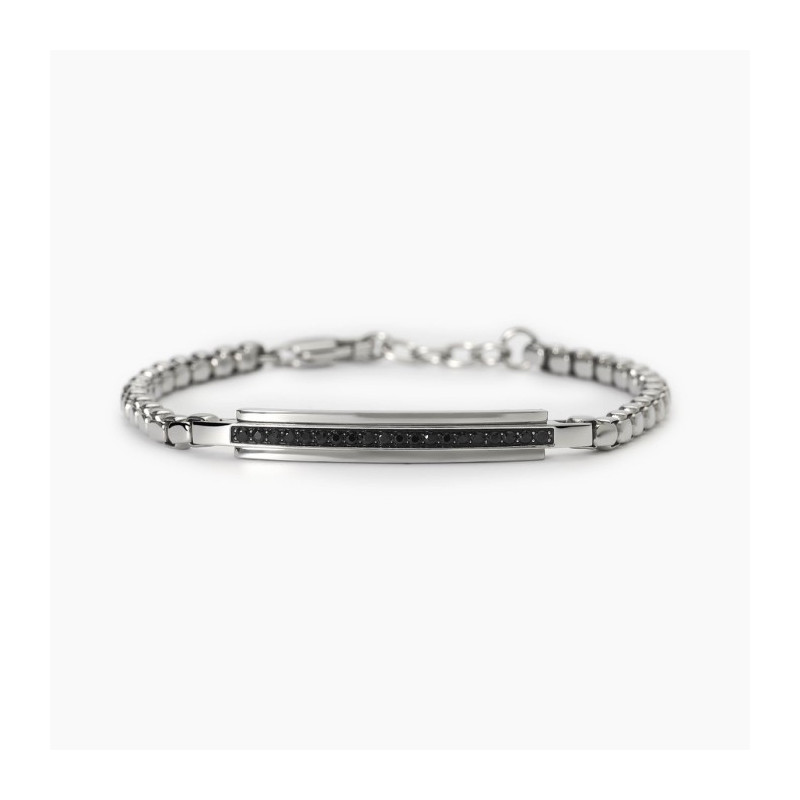 Descrizione: bracciale in acciaio 316L con piastra 46x5.85 mm con cristalli neri fi 1.5 mm, catena veneta 4 mm