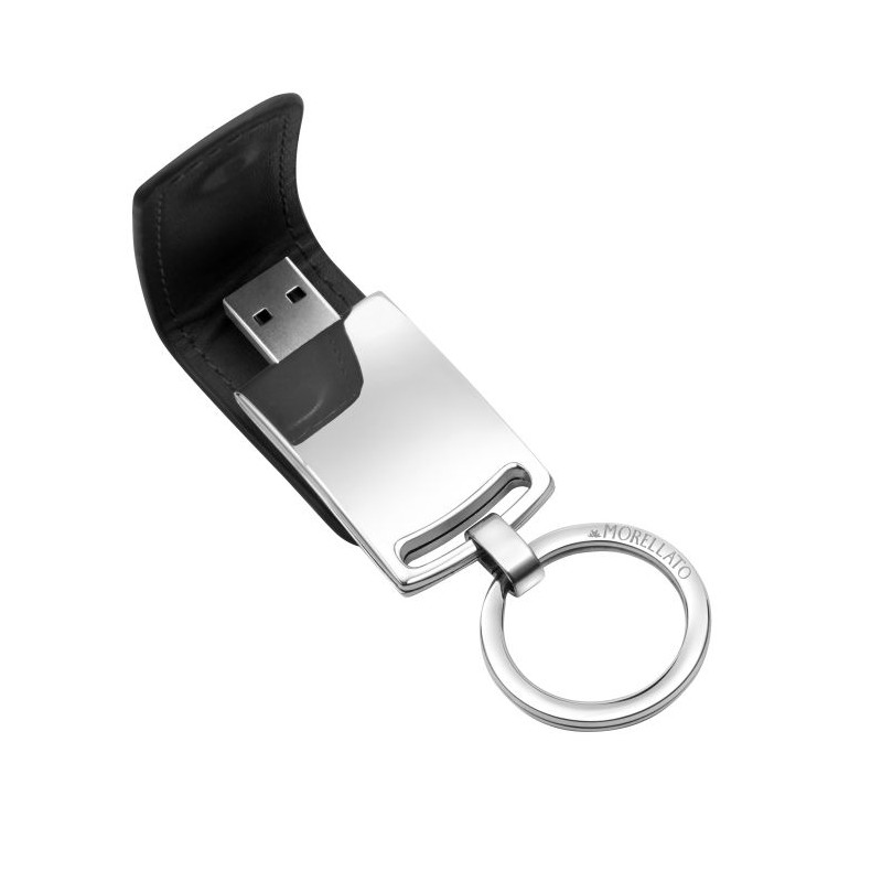 Descrizione: portachiave in acciaio e pelle con logo Morellato stampato e chiavetta USB