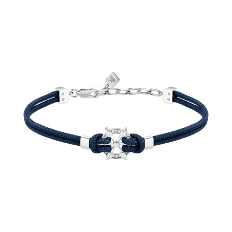 Descrizione: bracciale acciaio e cordino nautico con centrale a forma di timone - Materiale acciaio, nylon e cristalli