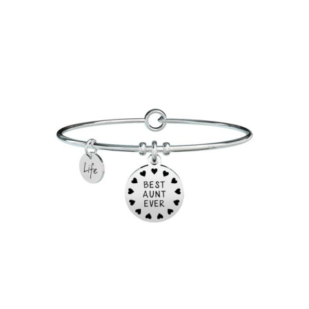 Descrizione: Bangle in acciaio con ciondolo tondo. • Incisione smaltata sul ciondolo e cristallo sul retro • Chiusura tonda • Misura unica, diametro 6 cm • Materiale: Acciaio 316L, Cristallo • Designed by Kidult in Italy