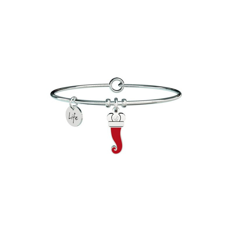 Descrizione: Bangle in acciaio con ciondolo a forma di cornetto smaltato rosso. • Smalto rosso e cristallo sul ciondolo • Chiusura tonda • Misura unica, diametro 6 cm • Materiale: Acciaio 316L, Cristallo • Designed by Kidult in Italy