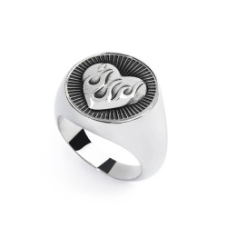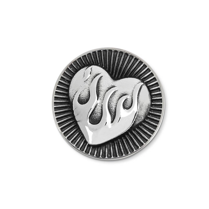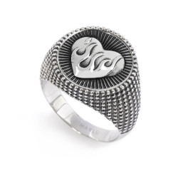 Descrizione: Piastrina tonda in acciaio per anello, con al centro un cuore in rilievo con fiamme. Intorno al cuore trama con linee con pvd nero.