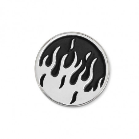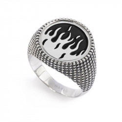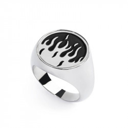 Descrizione: Piastrina tonda in acciaio per anello, con fiamme in rilievo su una base in black oil opaco.