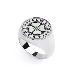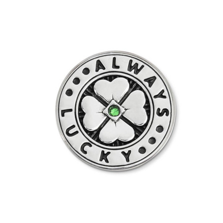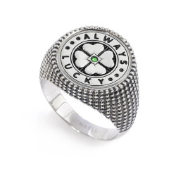 Descrizione: Piastrina tonda in acciaio per anello, con al centro un quadrifoglio in rilievo con un cristallo nanometer verde, sul fondo una trama a linee in pvd nero. Attorno la scritta "ALWAYS LUCKY" e tre puntini su ciascun lato in pvd nero.