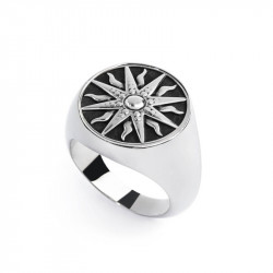 Descrizione: Piastrina tonda in acciaio per anello, con al centro un sole in rilievo su una base in pvd nero.
